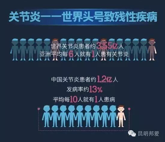 在亚洲地区,每六个人中就有一人在一生的某个阶段患上关节炎这种世界头号致残性疾玻目前,估计中国大陆的关节炎病人有1亿以上,而且人数还在不断增加。其中因为治疗不及时或不充分而引发的致残病例比比即是。