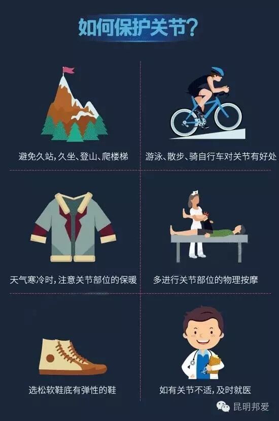 首先说预防,虽然关节衰老、磨损、退变不可逆,但却可以通过一些科学的方法或措施降低其速度和严重程度。至于方法,之前已经反复介绍过,这其中,避免关节长时间的磨损、负重、意外伤害,以及长期在阴冷潮湿的环境中,是预防关节炎特别是骨关节炎的首要前提。