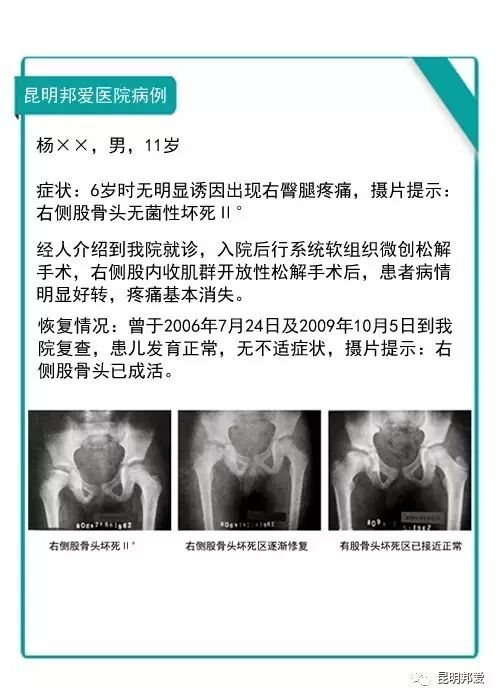 昆明晟邦疼痛病医院在长期的临床和科研中形成了对股骨头坏死这一疾病的正确认识,以及在此基础上设计的一系列有效的术式和独特的抗衡免疫平衡再生疗法,使在我院接受治疗的股骨头坏死患者绝大部分达到了理想的治疗效果,重新拥有了自己健康的股骨头。